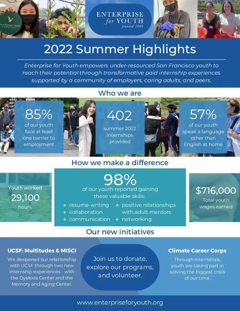 Enterprise youth completed 402 paid internships this summer! Youth gained direct work experience in a range of settings. Some youth worked at the UCSF Dyslexia Center, while others learned financial services skills at First Republic Bank. Meanwhile, other youth learned about running a small business while working for Jade Chocolates, Little Baobab, or other local entrepreneurs. We launched our Climate Career Corps with 236 youth learning about our vital and fragile ecosystem in partnership with the Golden Gate National Recreation Area, San Francisco Recreation and Parks, and a portfolio of green businesses.